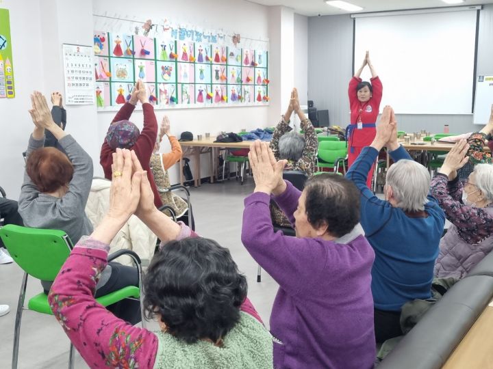 어르신들께서 이제 목소리도 크게 하시고 동작 하나하나 정성껏 따라 하시니 아리랑활력무